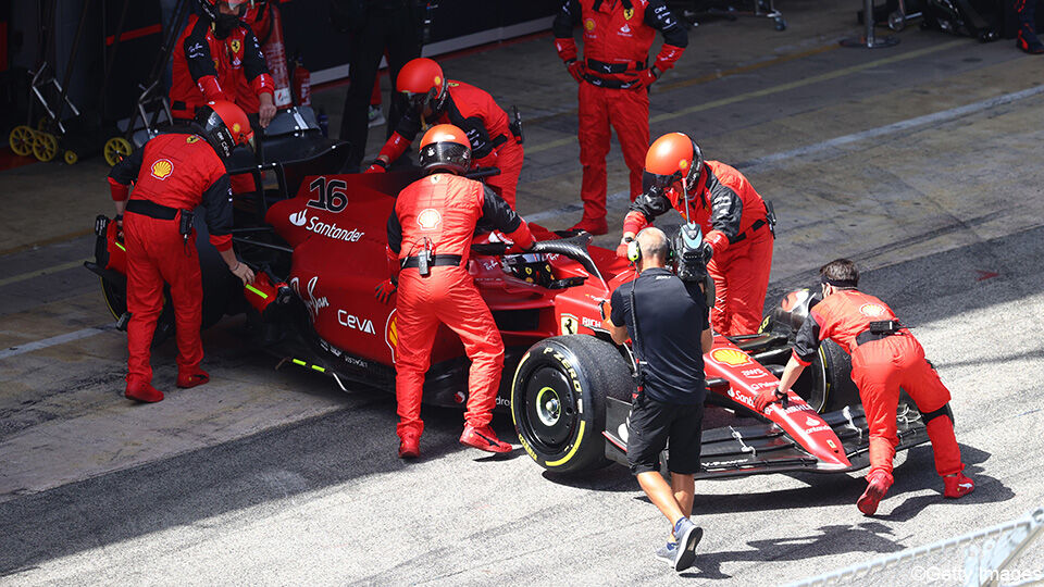 Tot Leclerc opeens stapvoets over het parcours sputterde: vermogenverlies. De Monegask was genoodzaakt om zijn Ferrari in de garage te parkeren.